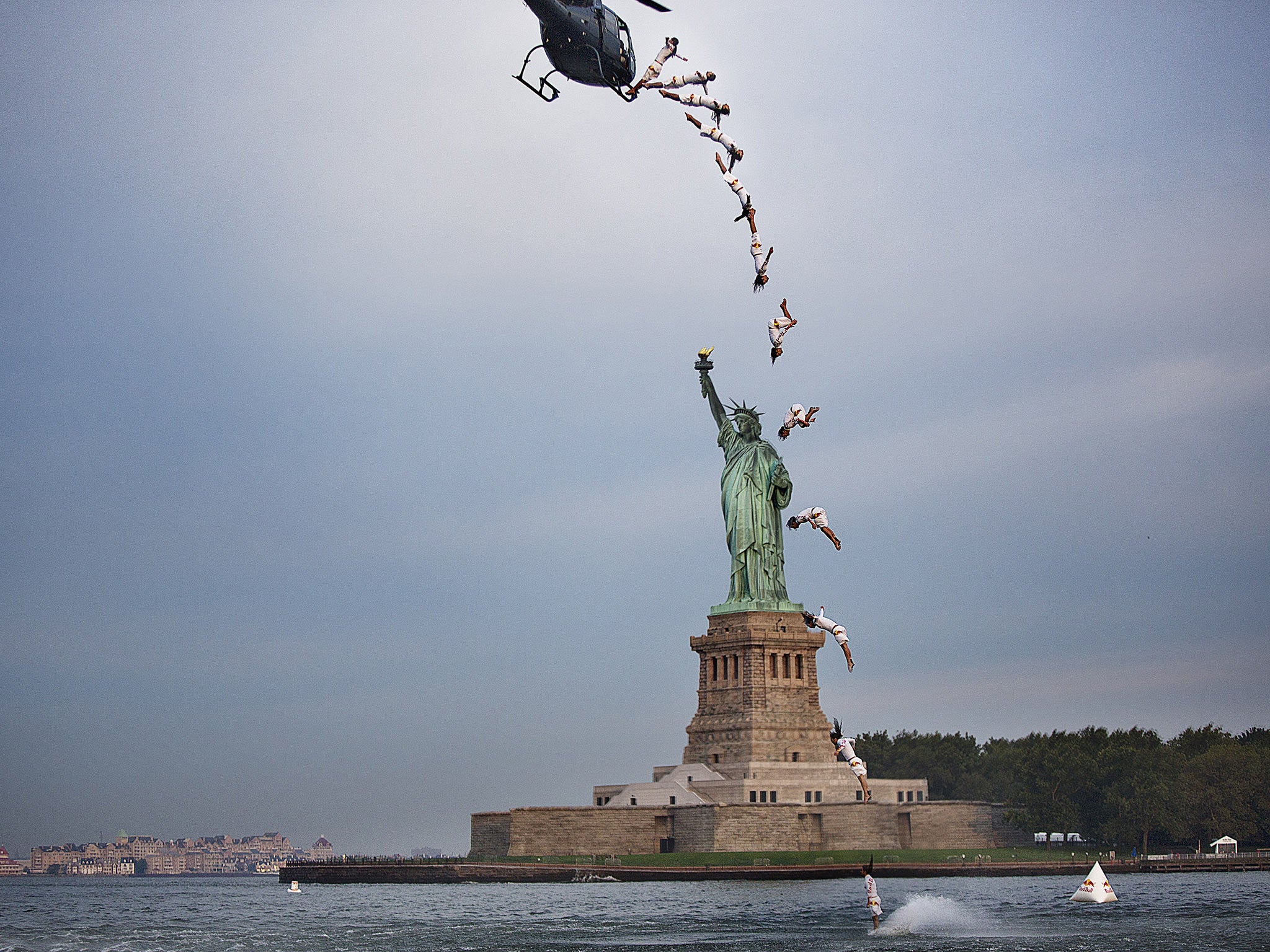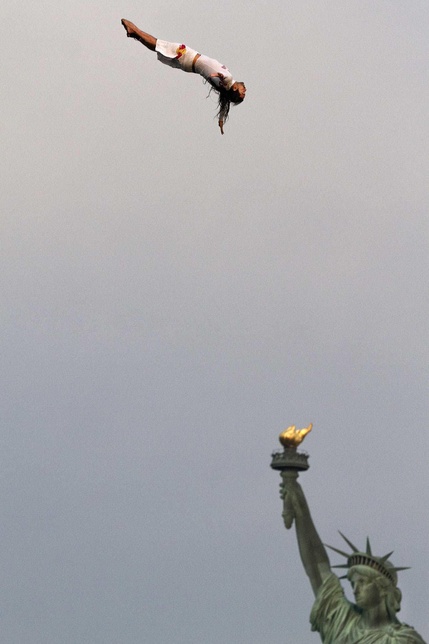 To mark the Red Bull Cliff Diving World Series heading to the US, 38-year-old Orlando Duque jumped out of a helicopter into New York Harbor in Manhattan - backwards.
