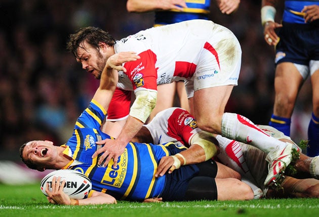 Saints did regain the lead when the diminutive Rob Burrow, of all people, went high in a tackle on Long and Eastmond again obliged. That advantage was short-lived. Keiron Cunningham, just back on the field after treatment on his hand, was penalised for interference on Kylie Leuluai, right in front of the St Helens sticks, from where Sinfield could not miss.