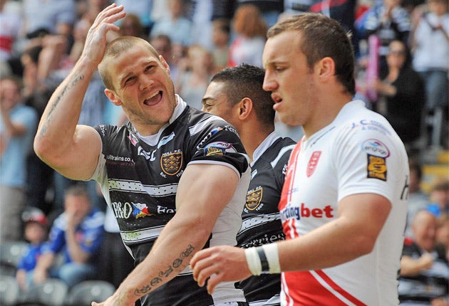 The former Great Britain centre, released by Wigan after disciplinary problems last month, scored the last try of a pulsating, fluctuating first half at the KC Stadium, putting Hull ahead for the third time.