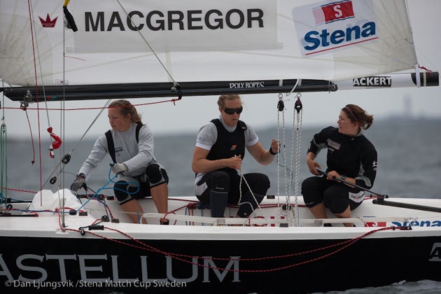 As the WMRT crews completed what is very limited training time in the 37-foot yachts, the women's tour was already under way. Britain's best hope for 2012, Lucy Macgregor, with sister Kate joining Annie Lush as crew, was reasonably happy with her 3-1 score on the opening day. But Germany's Silke Hahlbrock from Hamburg held the top spot with four straight wins and Katie Spithill, now Pellew, has three eins and no losses.