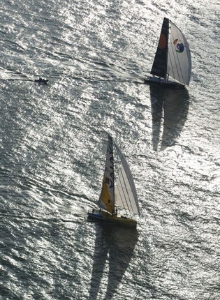 First casualty was the 50-foot trimaran Actual, which pitch-poled and capsized 22 miles north of Cherbourg , but co-skippers Jean le Cam and Yevs le Blevec were reported safe inside the upturned central hull, awaiting rescue but not needing emergency help.