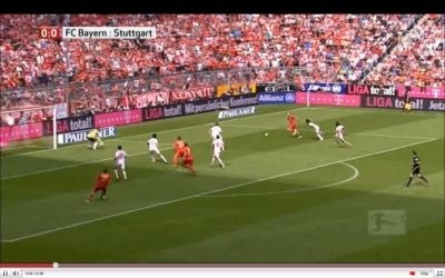 The 38-second video shows Arjen Robben skipping past several defenders in Stuttgart's penalty area before shooting. The ball goes under the keeper's outstretched arm and looks to be headed towards the far post - however, his teammate Klose then steps up and promptly sends the ball vertically over the cross bar to the disbelief of himself and everyone watching.