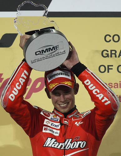 The Ducati rider produced a near-perfect display under lights to win the |22-lap race with a time of 42min, 53.984sec at the Losail International Circuit. The 23-year-old Australian finished ahead of the defending world champion Valentino Rossi of Italy and Jorge Lorenzo of Spain.