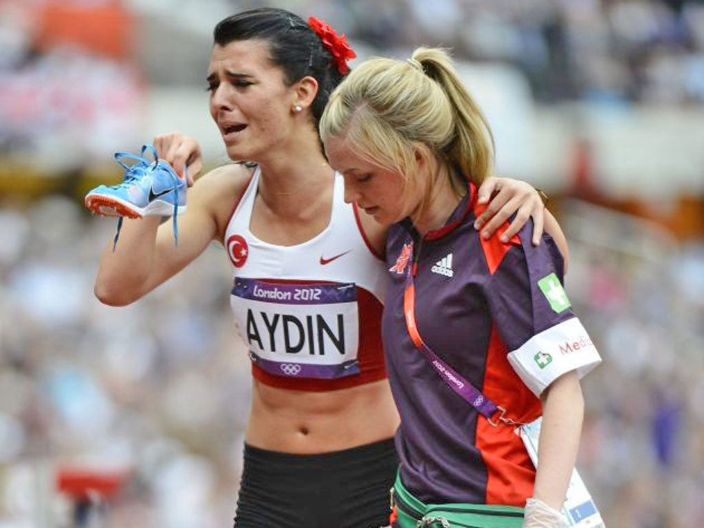 Turkish middle-distance runner Merve Aydin was injured at the end of the first lap of her heat of the women's 800m race in the Olympic Stadium, but continued around the track for the second lap to finish, in tears and in obvious agony, to huge cheers from the crowd.