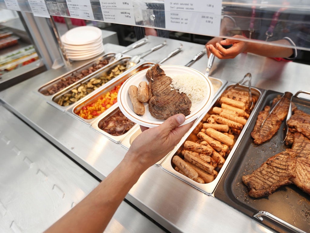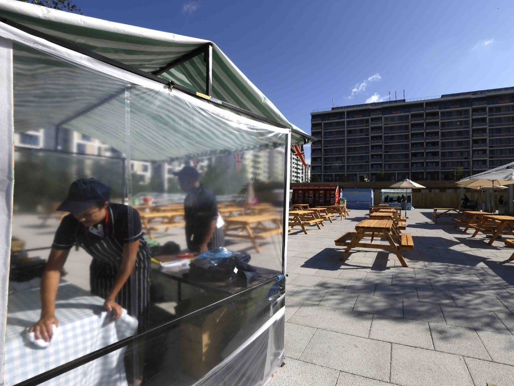 Behind us are three Jamaican 400m hurdlers and sprinters, who have piled three plates each with prawns and rice. Every nation's food is represented in this vast eating warehouse, and the most popular stations seem to be the African and Caribbean food, where queues build up quickly. The Best of Britain section, serving roast dinners and other British specialities, is like a ghost town.
