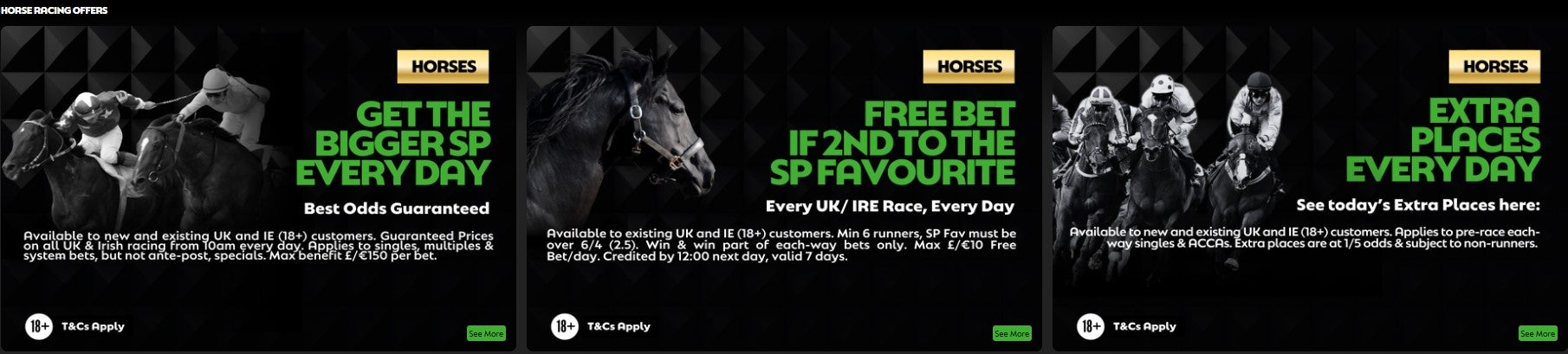 Bettors can get their money back as a free bet if their selection finishes second to the SP favourite on all UK and Irish races, while they sporadically give out free racing bets for placing a racing multiple, including system wagers, such as a trixie bet or a yankee bet, or betting on the final race of the day at selected meetings.