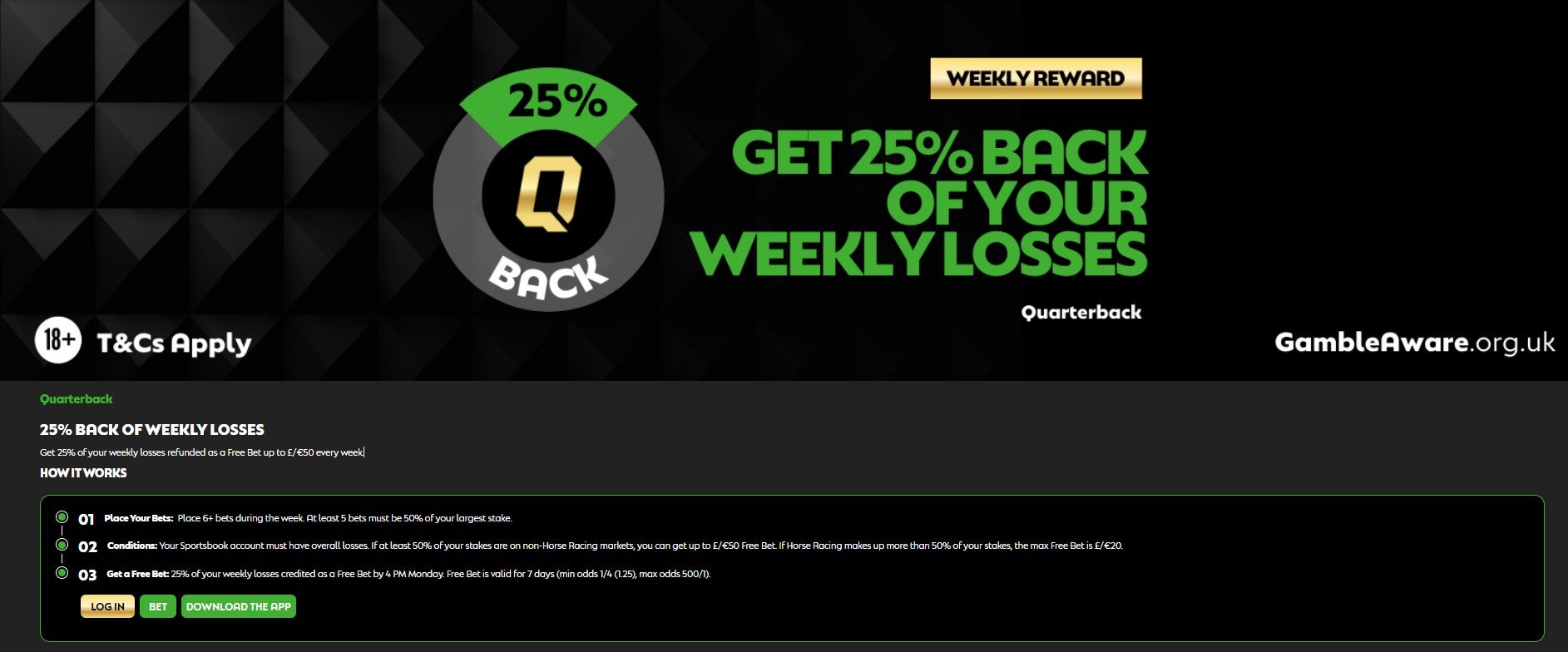 JeffBet offers a unique weekend cashback scheme running Thursday to Sunday, returning a portion of deposit losses in free bets, up to a maximum of £500.