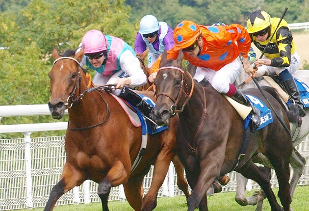 There was something of an action replay, too, in the Stewards' Cup, as Evens And Odds thundered home to deny Jonny Mudball by a neck in the last few strides. The 20-1 shot was the third winner in the six-furlong dash for the trainer Dandy Nicholls, for whom valuable handicaps are a specialist subject.
