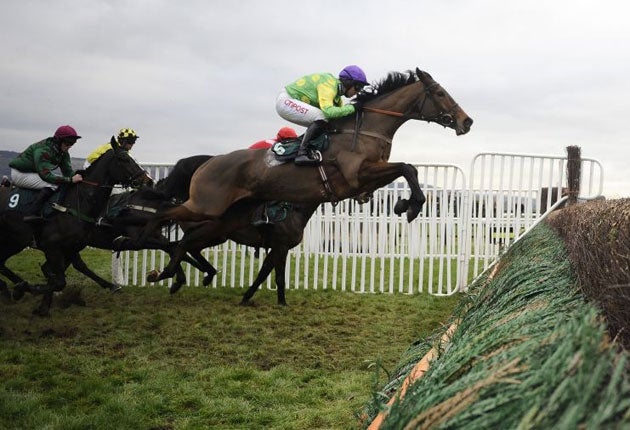 Ruby Walsh, his sidelined regular rider, has always maintained that the gelding's technique over a fence is the best of any horse he has ridden, full of power and scope but economical of effort with it, in the way he drops his neck forward into his shoulders in the air, more like a showjumper than a steeplechaser. Tony McCoy, who won the Tingle Creek Chase on him more than two years ago, is in the saddle again.