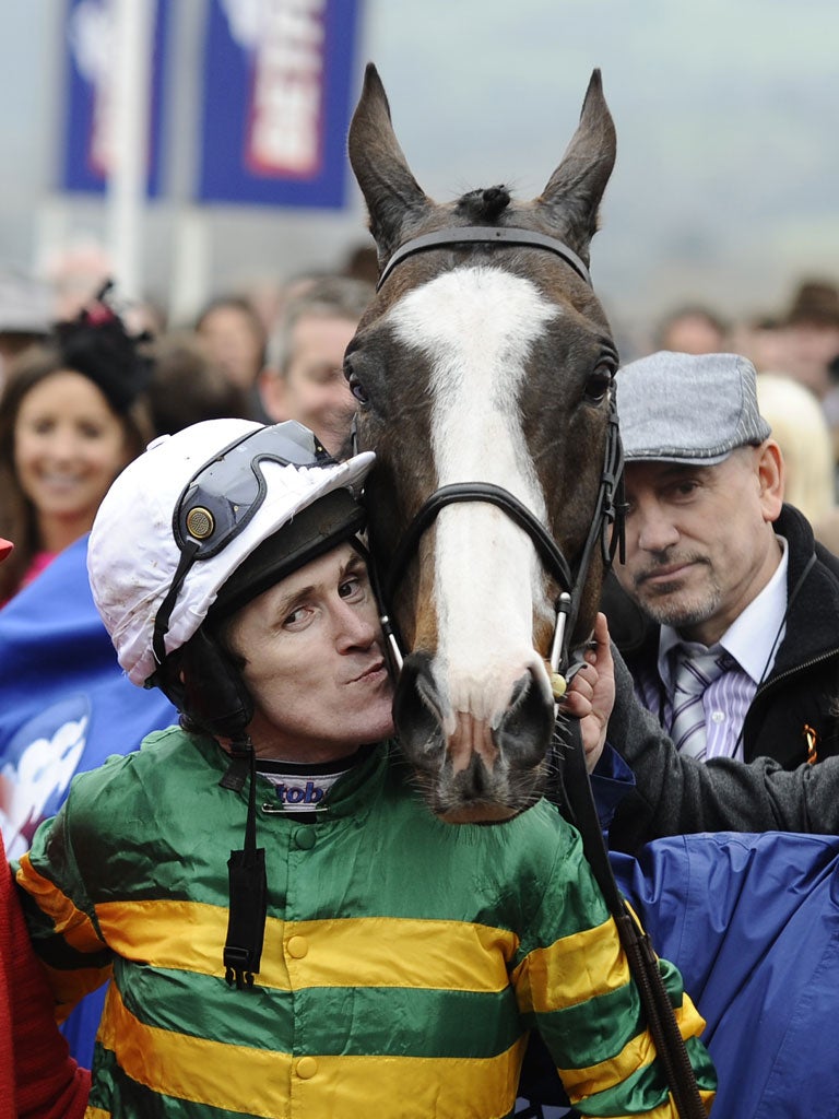 Ridden by veteran jockey Tony McCoy, the nine-year-old winner of last month's Cheltenham Gold Cup earlier escaped his rider, running most of the way around the course in a state of agitation before being brought under control for the start of the race proper. The thoroughbred steeplechaser fell at Becher's Brook after which he carried on riderless until he stopped after the Canal Turn where he was found to have an untreatable fracture on a hind leg and was put down. The other mount who died – According to Pete – fractured a foreleg also after falling at Becher's. Two other horses, Killyglen and Weird Al, were receiving veterinary treatment yesterday after falls.