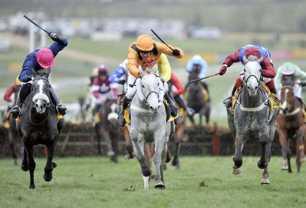 The ears had it here yesterday. Where horses are concerned, those organs of hearing are an almost infallible guide to mental attitude and physical demeanour and so it proved up this demanding climb to the finish. At the end of the opening Triumph Hurdle, two greys attacked the final hurdle as one, zipping low over the obstacle with bold do-or-die leaps and both apparently under maximum pressure.