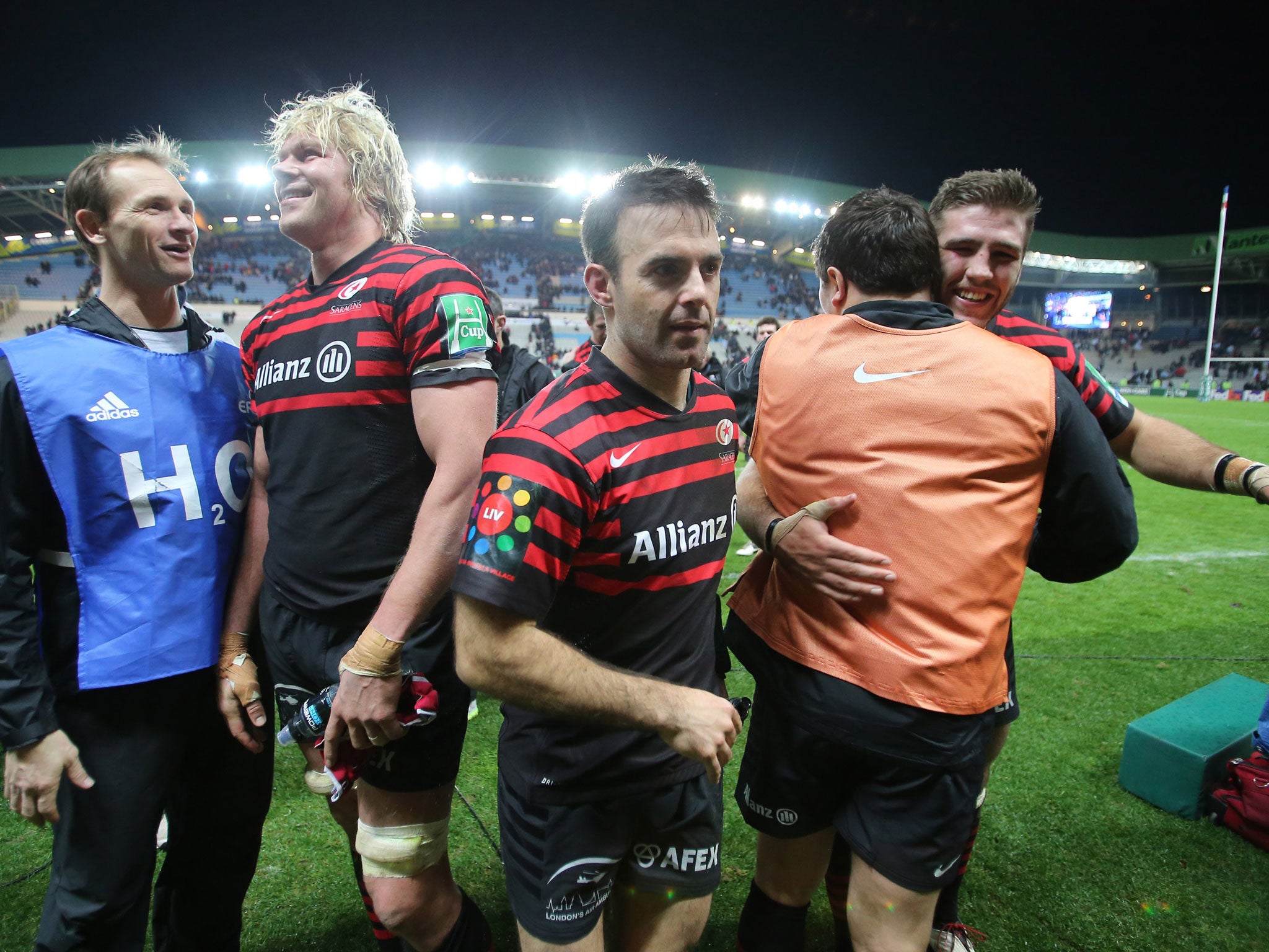 Saracens C Wyles; C Ashton (sin -bin, 55-65), J Tomkins, B Barritt, D Strettle (D Taylor, 3); O Farrell, R Wigglesworth (N de Kock, 52); R Gill (M Vunipola, 42), S Brits (J Smit, 62), M Stevens (P du Plessis 70), S Borthwick (capt), M Botha, K Brown, E Joubert, W Fraser (sin-bin, 24-34).