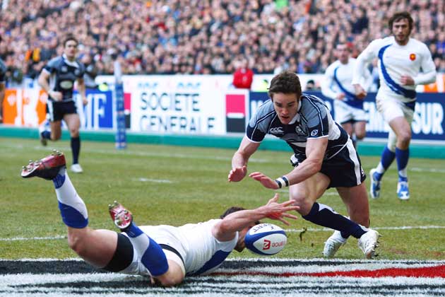 It was the Scots who managed the better raids in the second half. But only once were they successful, when their impressive fly-half, Phil Godman, dashed into the French 22. The forwards drove on and assaulted the French line before Godman put the wing Thom Evans over with an inside pass. Chris Paterson converted but the Scots could not get any closer.