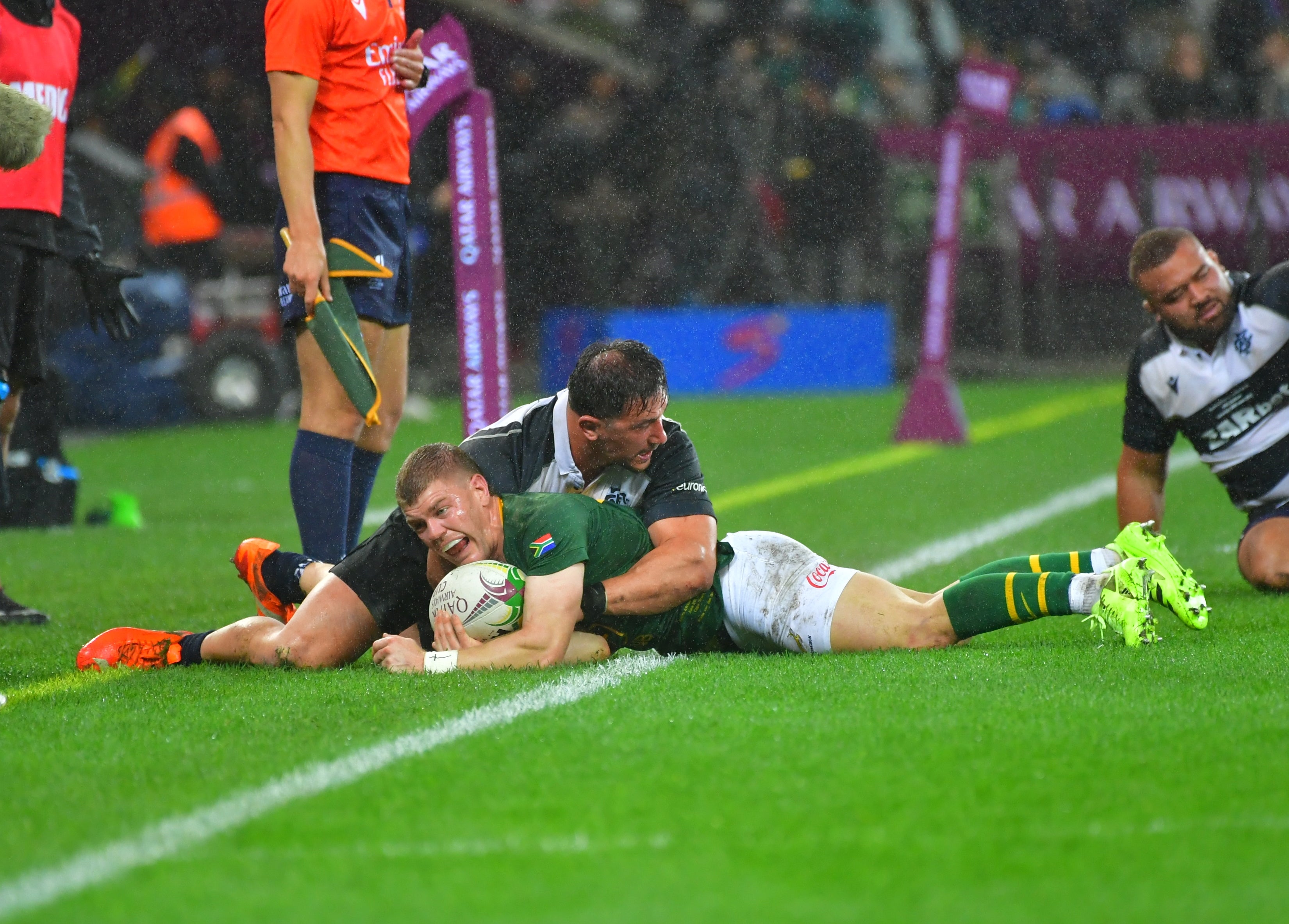 Springboks pick up another one, Kolbe races forward and pops out to Libbok but Jaminet brilliantly covers to tackle him into touch.