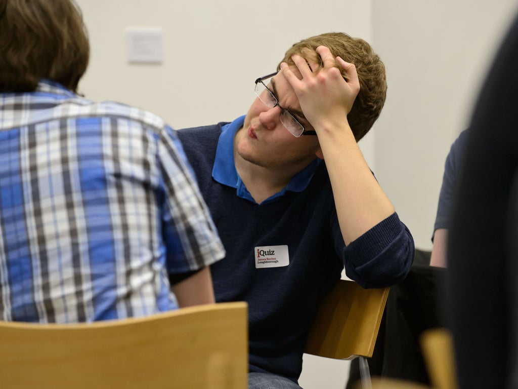 StudentiQuizThe second iQuiz final - in picturesOnce again, teams of the UK's brainiest students are dashed on the rocks of the most fiendish quiz questions yet devised by manBookmarkCommentsGo to commentsBookmark popoverRemoved from bookmarksClose popoverThe second iQuiz final - in picturesShow all 14Wednesday 29 May saw Birmingham host the second iQuiz final. Here are shots of the action.Join our commenting forumJoin thought-provoking conversations, follow other Independent readers and see their repliesComments
