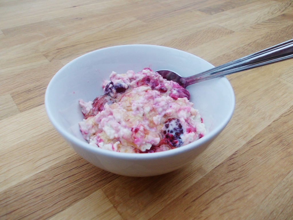 Grab a cereal bowl and add equal measures of plain yoghurt and porridge oats. Mix and add frozen fruit and squeeze/heaped teaspoon of honey. Pop it in the fridge overnight so the oats can expand and the fruit can defrost.