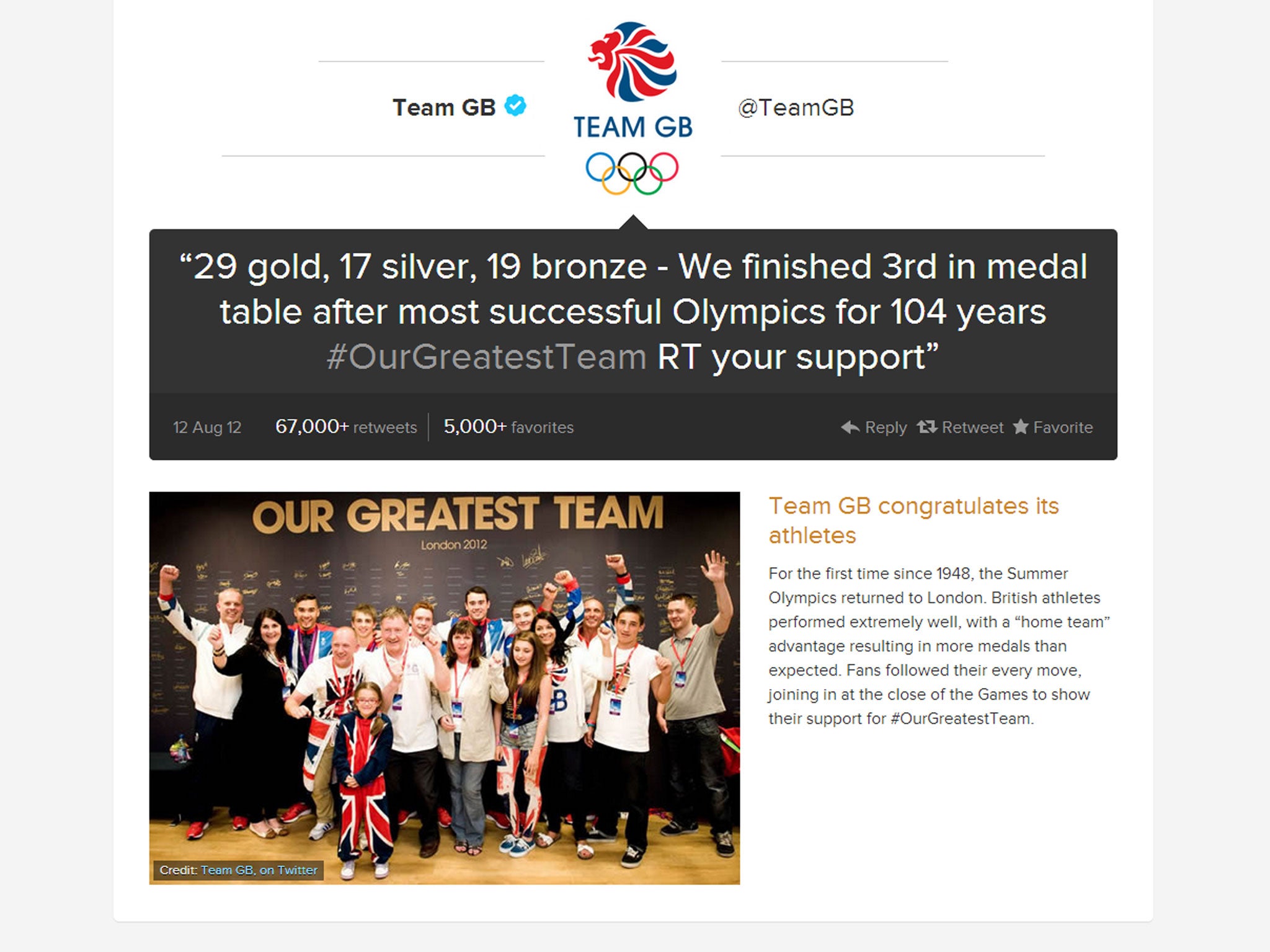 The London Olympics was one of the most tweeted subjects of the year, according to the website 2012.twitter.com, with a tweet from Team GB retweeted over 67,000 times and 150 million tweets went out about the Games. The closing ceremonies (specifically, the Spice Girls’ performance) amassed the largest Games-related spike, 116,000+ Tweets per minute.