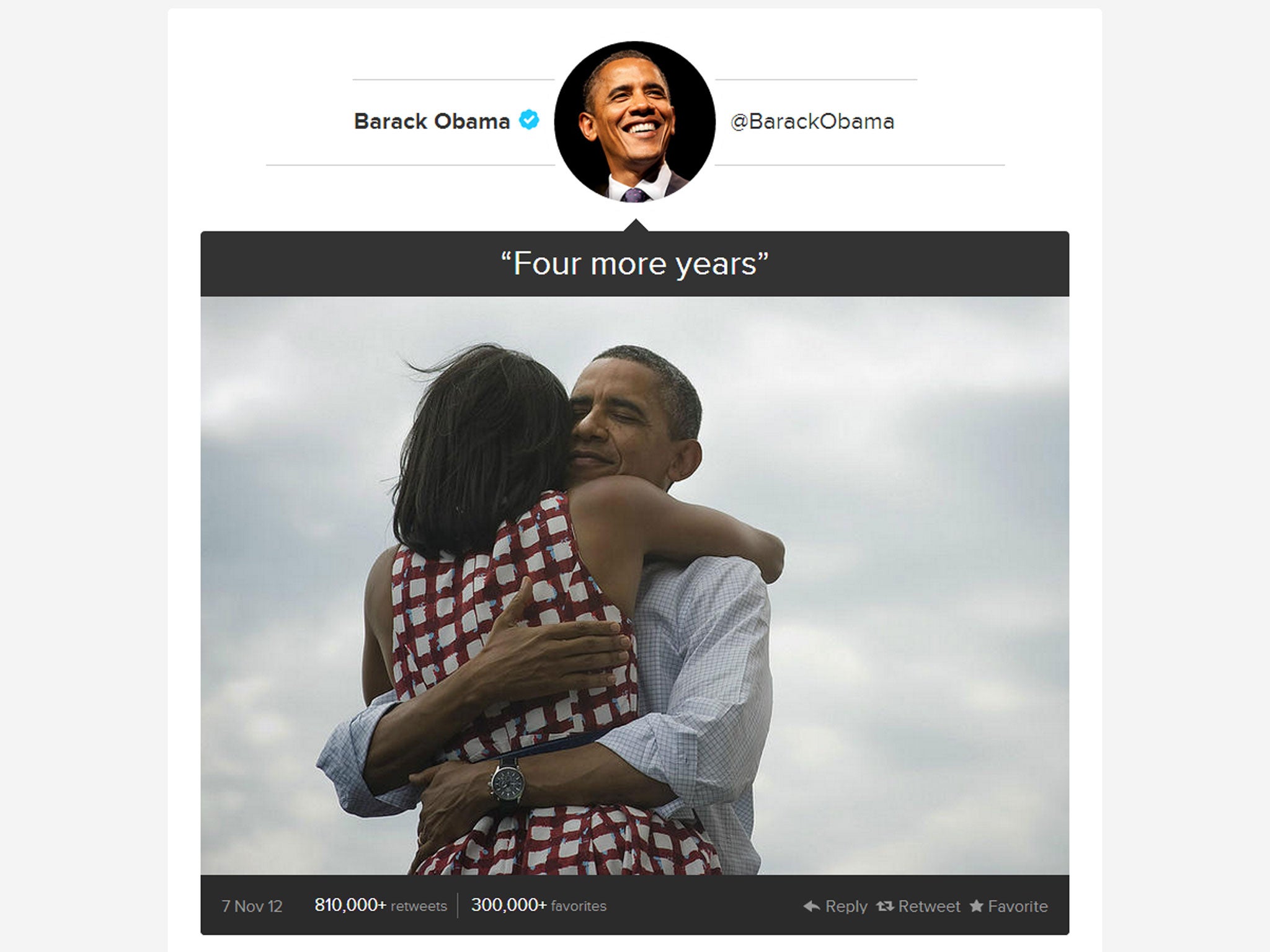 Barack Obama's "Four more years" tweet was the most repeated, with more than 810,000 retweets, the tweet, which included a picture of Obama hugging his wife Michelle, went global within two minutes of being sent.