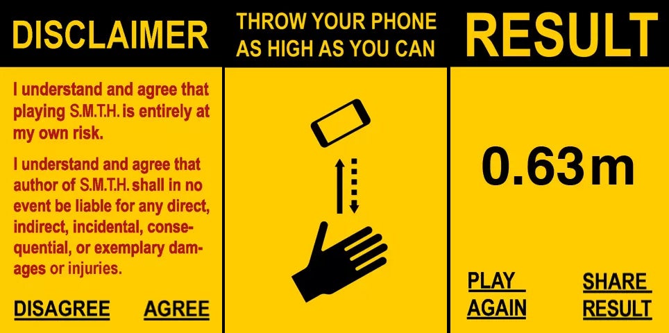 Those who want to answer these questions and find out exactly how much value their phone has to them are advised to try their hand at SMTH. Tactics suggested for record-settings scores include a drunken indifference to your phone’s wellbeing and a comprehensive insurance policy.