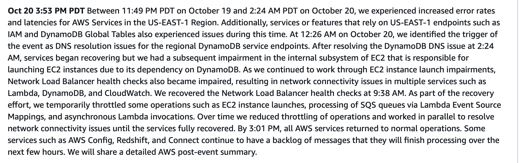 “One interesting challenge is that the back channels a lot of tech people use to communicate information/tech details about ongoing outages are also taken down by this outage - hence our usual ways of learning (e.g. via signal or slack) are both currently stymied by the AWS outage,” he said.