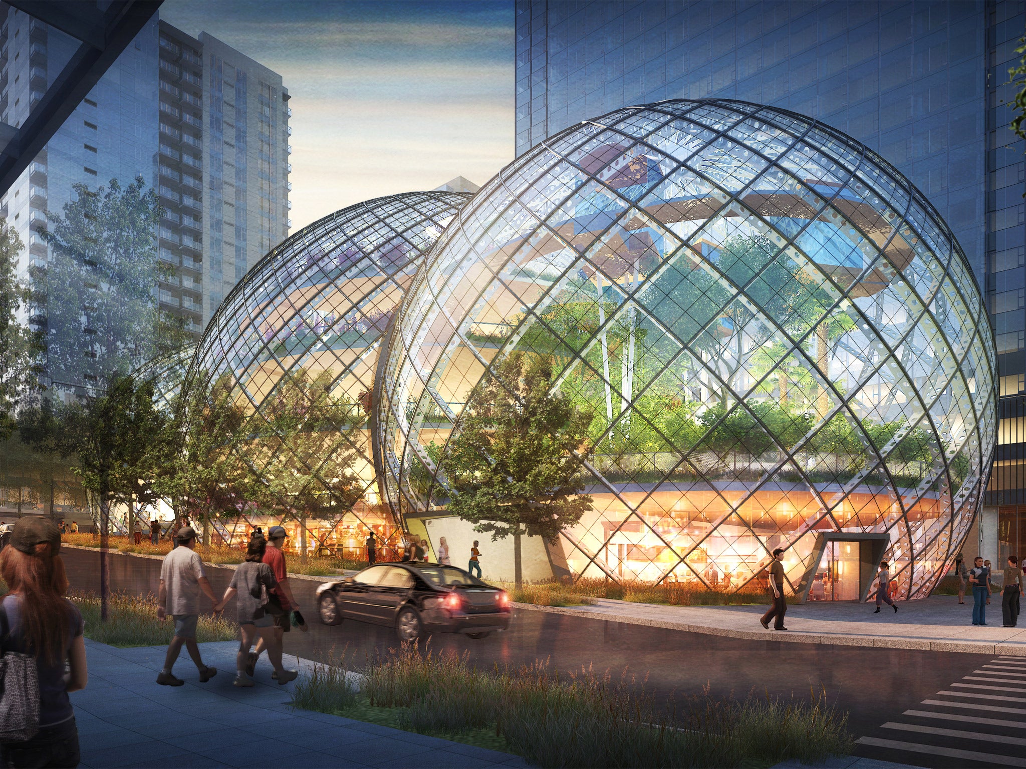 Yet it is Amazon’s plans for downtown Seattle that boggle the most. Right next to three proposed 38-storey office towers will be the two huge glass biosphere domes crammed with plants and trees for staff members to roam in. The company aims to “create an alternative environment” where “employees can work and socialise in a more natural, park-like setting”.