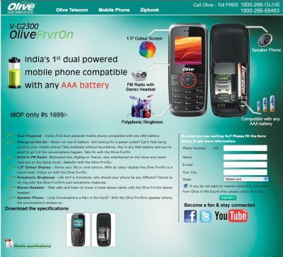 Priced at 1,699 rupees (35 dollars), Olive Telecommunications' "FrvrOn" - short for "forever on" - has a rechargeable lithium-ion battery common to mobile phones, but also a facility to include a AAA, dry-cell battery.