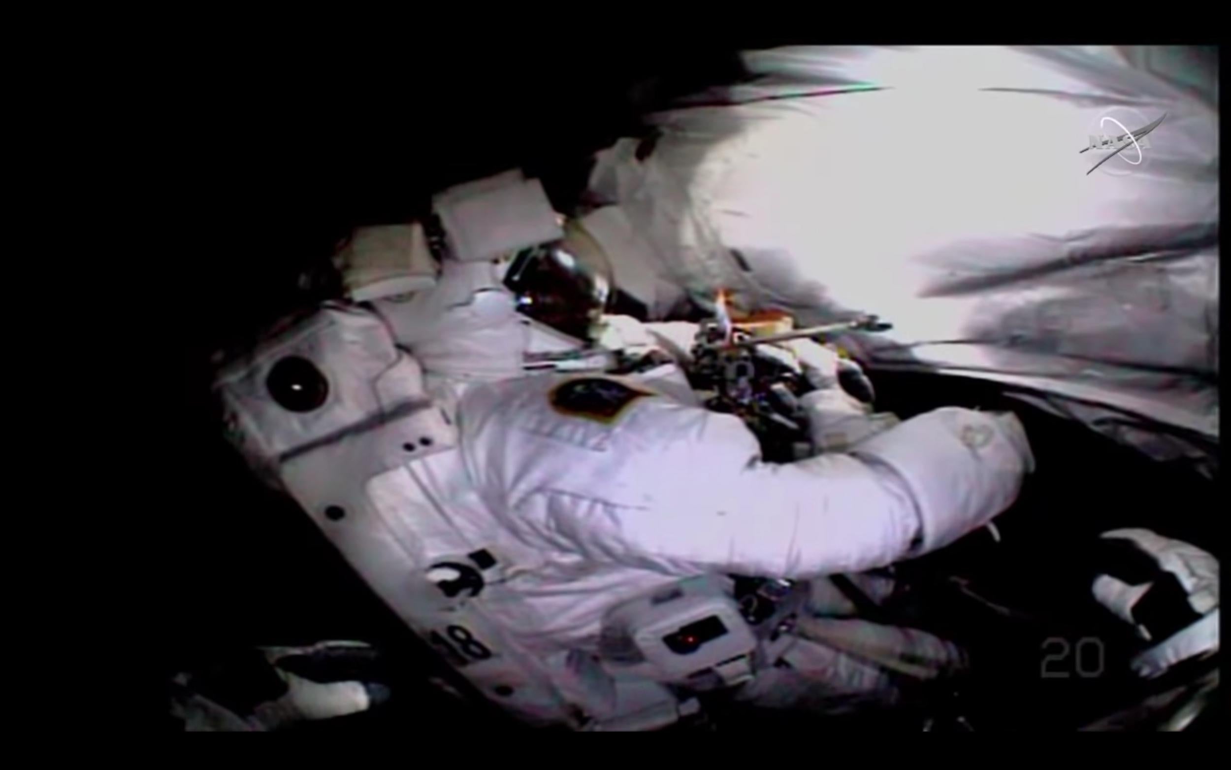 Last month, Morgan and Parmitano installed new coolant pumps on the spectrometer. They went back out Saturday to check for any leaks in the plumbing.
