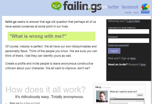 The service, the brainchild of two Americans, Danny Peck and Stephen Celis, is called "Failings". You can find it at http://Failin.gs, and the notion is alarmingly simple. You register, put up a bit about yourself, then invite your friends to comment. They will enjoy an impenetrable wall of anonymity. Not only have you nowhere to hide on the Failin.gs site itself, but thanks to the magic of the web, you can be automatically horribly exposed on Facebook and Twitter. And so the destiny of the net as a mechanism for the global trading of insults is being fulfilled.
