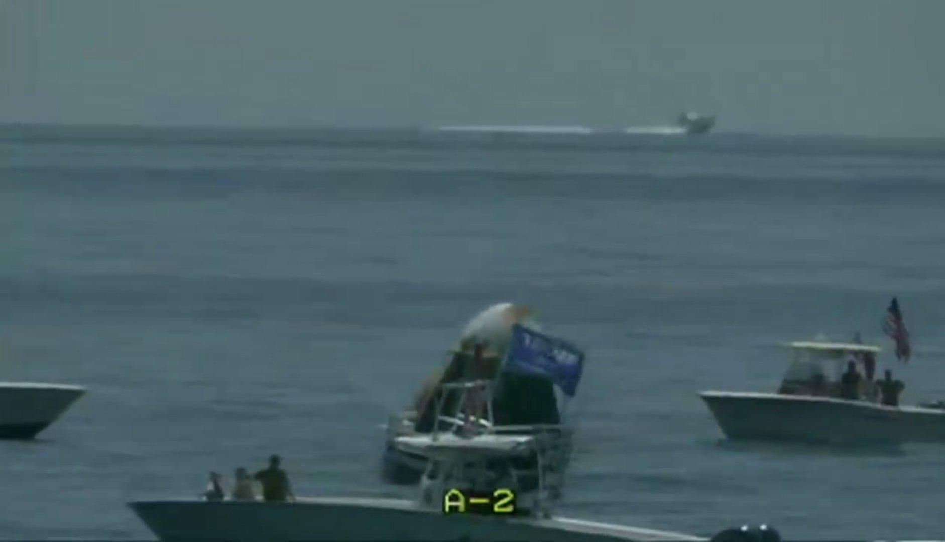 One of the numerous people who had apparently sailed to watch the splashdown was carrying a Trump flag, which was clearly visible on the official live feed.