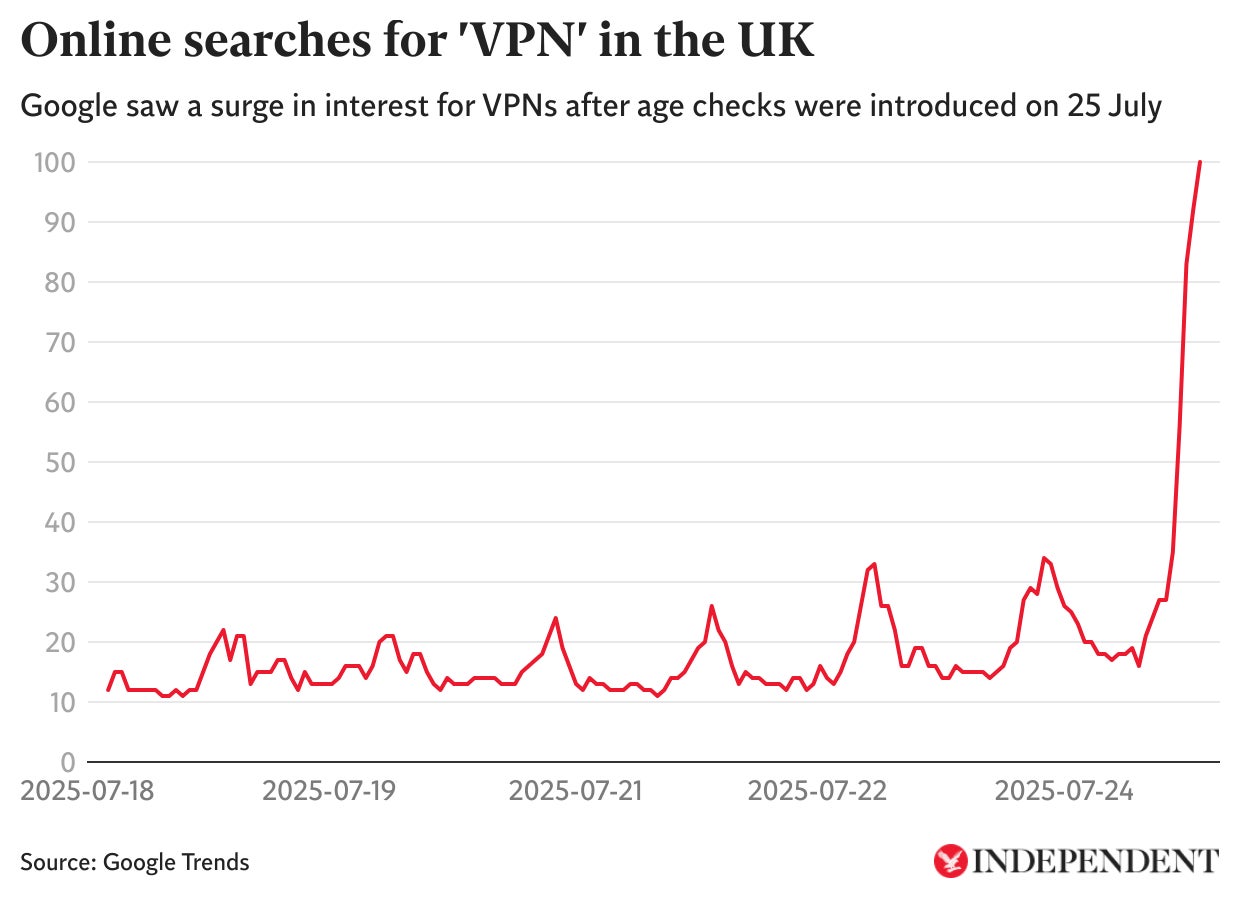 Data from Google Trends shows that searches for the term ‘VPN’ shot up more than 700 per cent on Friday morning, suggesting that web users are attempting bypass the age checks.