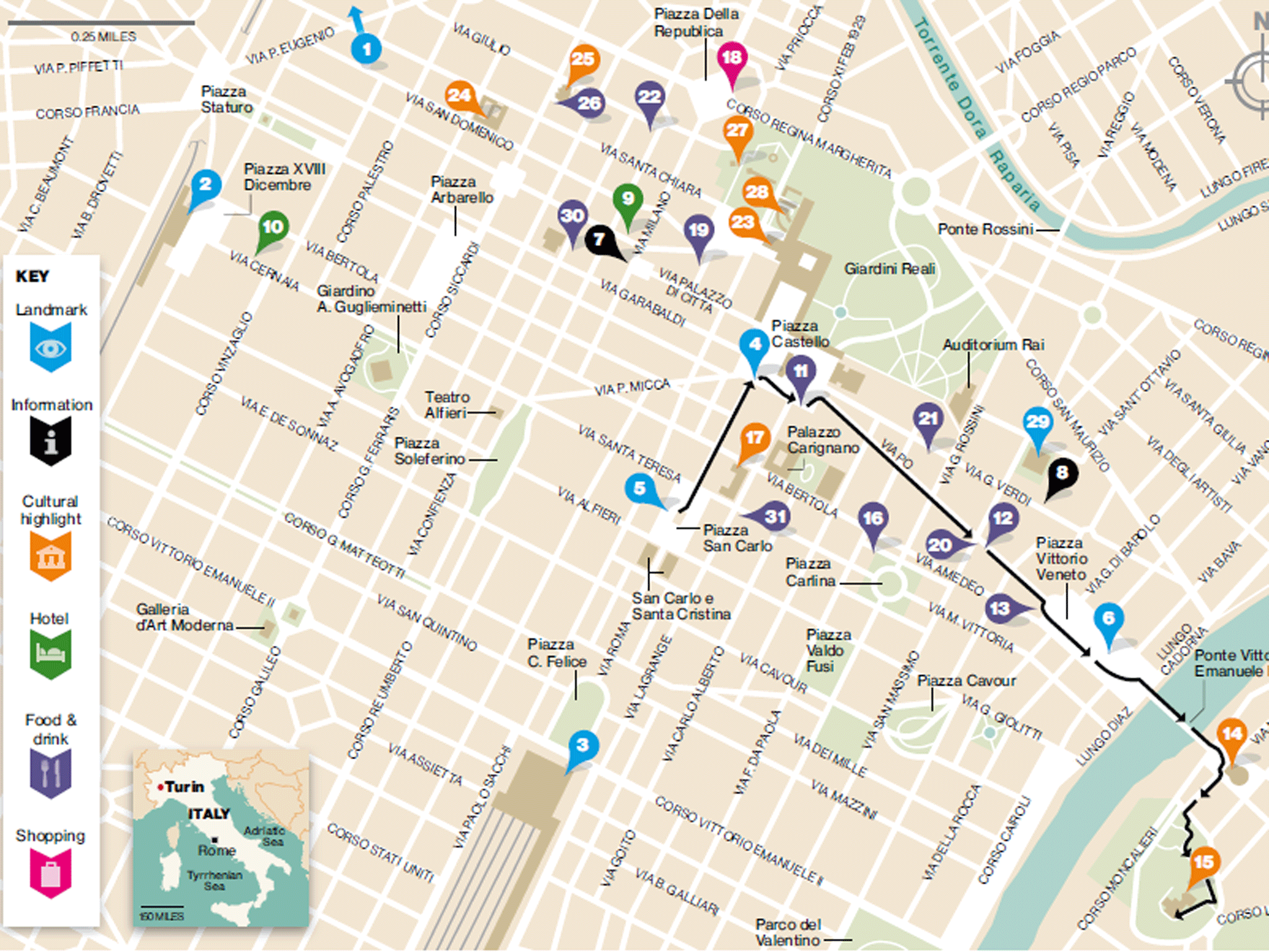 Louis Armstrong has been among the better-known guests since Grand Hotel Sitea (6) opened its doors in 1925 at Via Carlo Alberto 35 (00 39 011 517 0171; tiny.cc/ ki4ia). It is 10 minutes' walk from Porta Nuova station (2). B&B starts at €184.