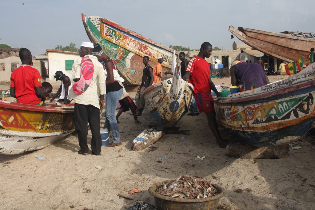 I also stopped off at Tanje, a coastal village to the south of the capital, Banjul, where a flotilla of fishing boats drop off their catch at the end of each day. I mean "drop off" quite literally. The boats approach the shore, bob in the waves, and wait for porters – mainly women – to collect buckets of fish and carry them back to shore on their heads. The buckets are large, but I saw several women with a baby tied to their back venture out into the surf to collect their load.