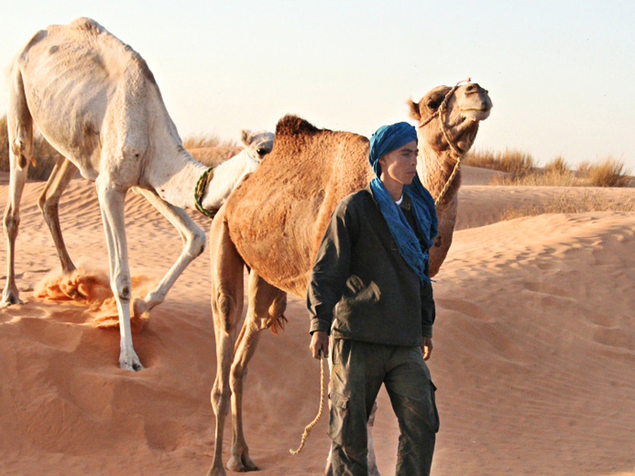 This wasn't a conversation I'd expected, certainly not while trekking through the fringes of the Sahara, a place where political writ seemed to lack relevance. We walked on in silence, Walid's camel and those following describing a wandering route through the maze of dunes. In common with some tourists, camels are grumpy, complaining beasts. From Douz, a central Tunisian town fettered by the dusty epithet "Gateway to the Sahara", we'd walked for three days. Fresh-faced tourists had soon become desert-adapted, heads wrapped in turbans leaving just enough space for sunglasses; humour replaced hygiene and sand had conquered all.