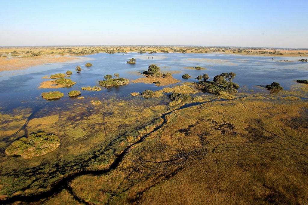 Although the delta appears to be a jungle, it is best thought of as an oasis within a desert. Indeed, as a natural phenomenon, at times it appears to be a big mistake. Rivers, after all, are supposed to drain into other bodies of water, but the delta simply marks the spot where the Okavango River flows into a flat, depression in the Kalahari Desert. (The altitude in this part of Botswana does not shift by more than two metres.) The entire delta covers an area more than twice the size of Devon.