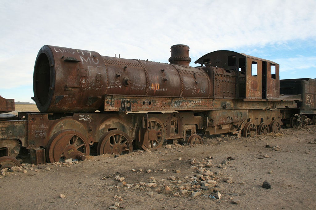 The next morning, I drove north-east, stopping at the abandoned mining town of Pulacayo to see the last train robbed by Butch Cassidy and the Sundance Kid before the Bolivian army tracked them down and killed them. Beyond it, via some grand mountain scenery, was Potosí, the highest city in the world, where I stayed overnight. The city has a tragic past. It is known as Cerro Rico ("Rich Hill") for its large deposits of silver and other valuable metals. An estimated nine million workers died during the intense mining projects of the Spanish colonisers.