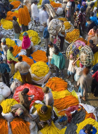 For a very different angle on Bengali life we headed due south to the city's holiest site, the Temple of Kali (from which it is thought the name Kolkata ultimately originates). As you approach this shrine of the fierce goddess and wife of the great deity Shiva, you pass through the red-light district. The all-senses onslaught of colour, aromas, hand-pulled rickshaws, carts, cows, Hindustan Ambassador taxis and more is both bewitching and bewildering. We joined crowds of pilgrims buying flowers and cakes at the temple entrance and then wandered through the outer courtyards, glimpsing the image of Kali in an inner sanctum and glad to have missed a recent goat sacrifice – apparently undertaken with one clean stroke of the knife.