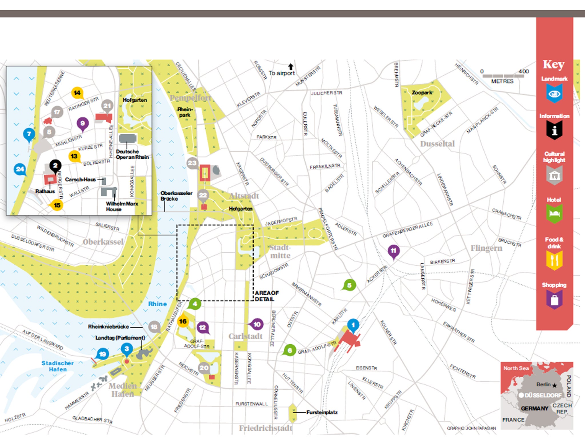 Düsseldorf is a major international business centre in western Germany that sprawls prettily along the Rhine, but its core is the compact Altstadt (old town). The main tourist office (2) is at the corner of Markstrasse and Rheinstrasse (10am to 6pm; 00 49 211 17 202 854; duesseldorf-tourismus.de).