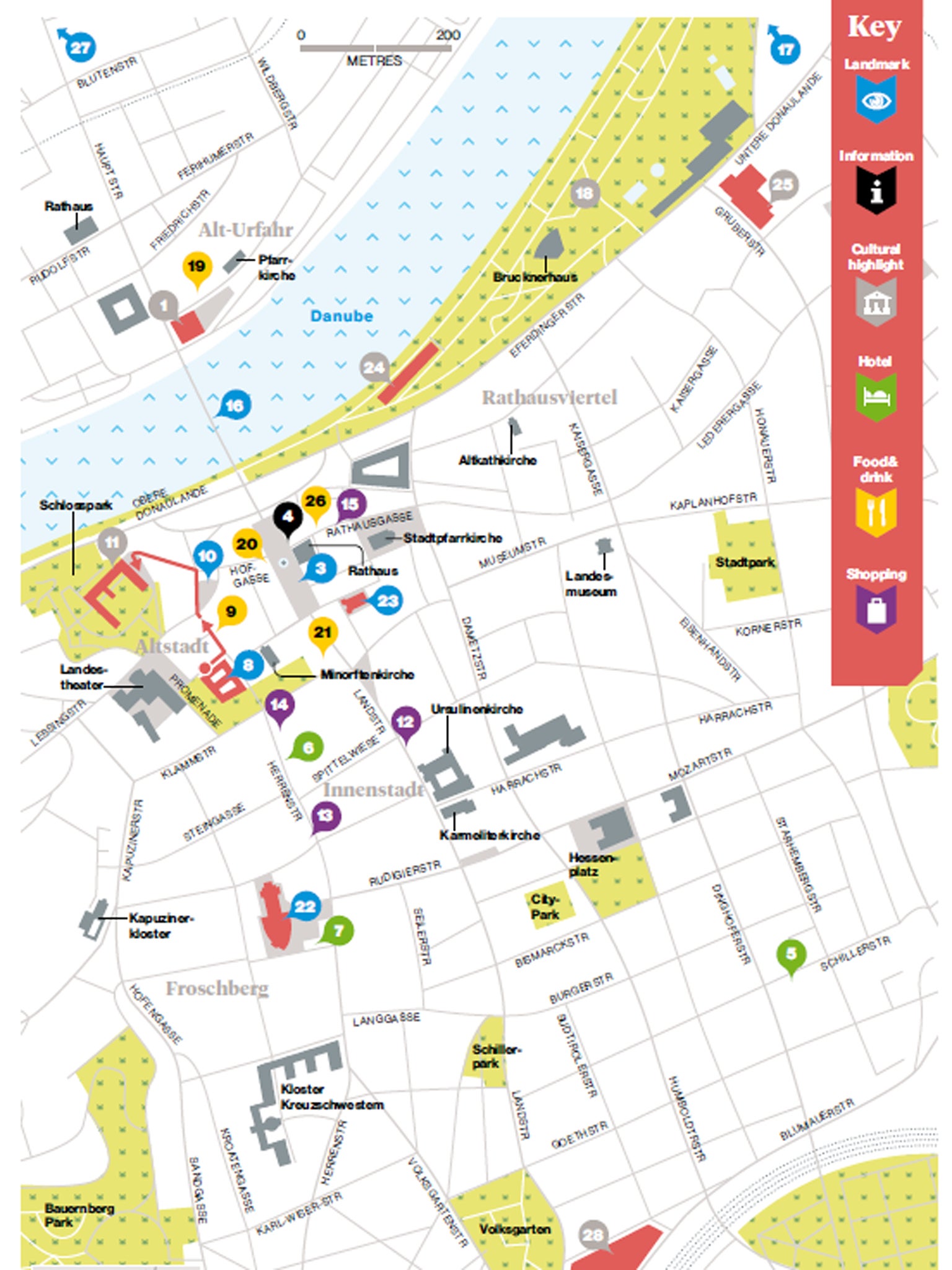 Landstrasse is the commercial drag, forging south through the Innenstadt. Its key retail option is the shiny Passage (12) mall at 17-25 (00 43 732 798 180; passagecitycenter.at). At number 22 on parallel Herrengasse, Jindrak (13) (00 43 732 775 258; linzertorte.at), is a patisserie that dispenses the Linzer Torte – a sweet lattice tart heavy with honey and almonds. At number 5, Xocolat (14) is an Austrian chocolate specialist (00 43 732 770 989; xocolat.at).