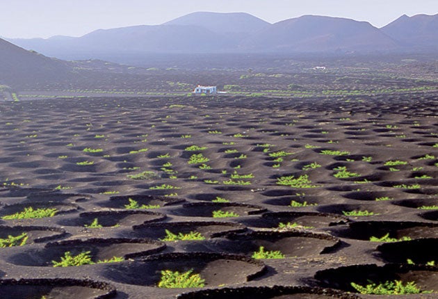 A swathe of terrain is pocked with craters, each about the size of a child’s paddling pool. One vine has been planted in the middle of every crater and packed with volcanic dust that attracts dew each