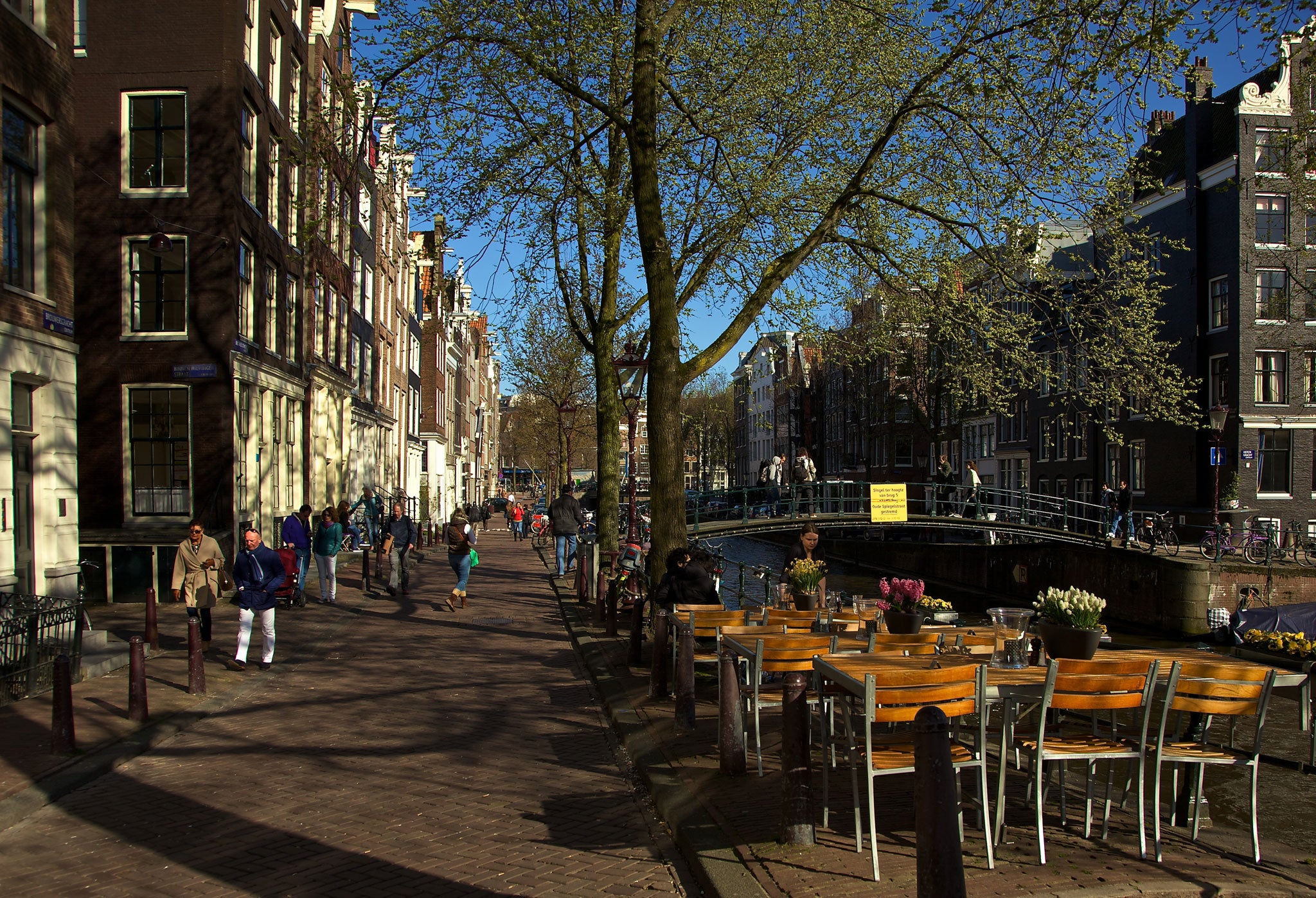 During summer weekends, much of the Canal Ring resembles a street party in a provincial village. Children run around freely on the narrow traffic-free cobbled streets, while teenagers play ball games. On many of the canal corners, particularly those that intersect with the bridges, cafés spill over on to the narrow streets.