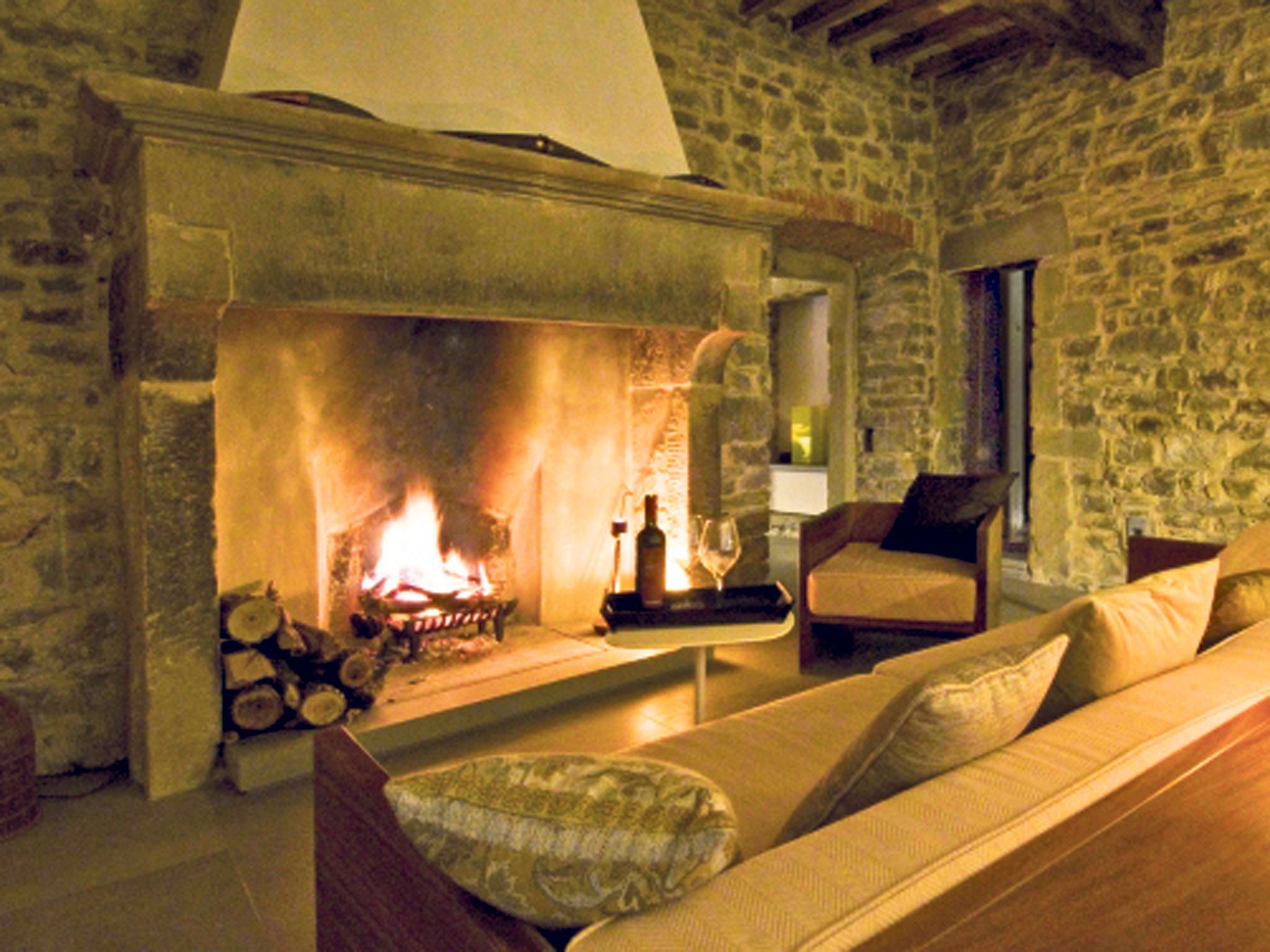 The interior is an artful mix of ancient stone, old beams and contemporary designer chic. It was designed, apparently, to feel like an old street in Perugia, with light in the public spaces, internal windows with shutters on, and rooms which "interact with each other". The result isn't always cosy, but it's always smart. The two enormous sitting rooms, where you can chat, when it's cold, by a massive fire, have giant sofas and a tasteful selection of artefacts and books. The dining room, which leads out to the terrace and the kitchen, feels a bit like a super smart dungeon with very nice furniture and a chandelier.