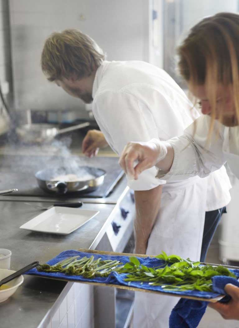 Peak foraging time is late spring and early summer; in winter the ground is covered in a metre-and-a-half of snow and the lakes freeze over. We find wood sorrel and morel mushrooms, but Nilsson has already been out and collected fiddlehead ferns and ground elder for the evening's meal. Nilsson shows us the beds where about 100 varieties of vegetables are grown, including the strong flavoured Jamtlandian grey pea which Nilsson says is the only variety that ripens this far north.