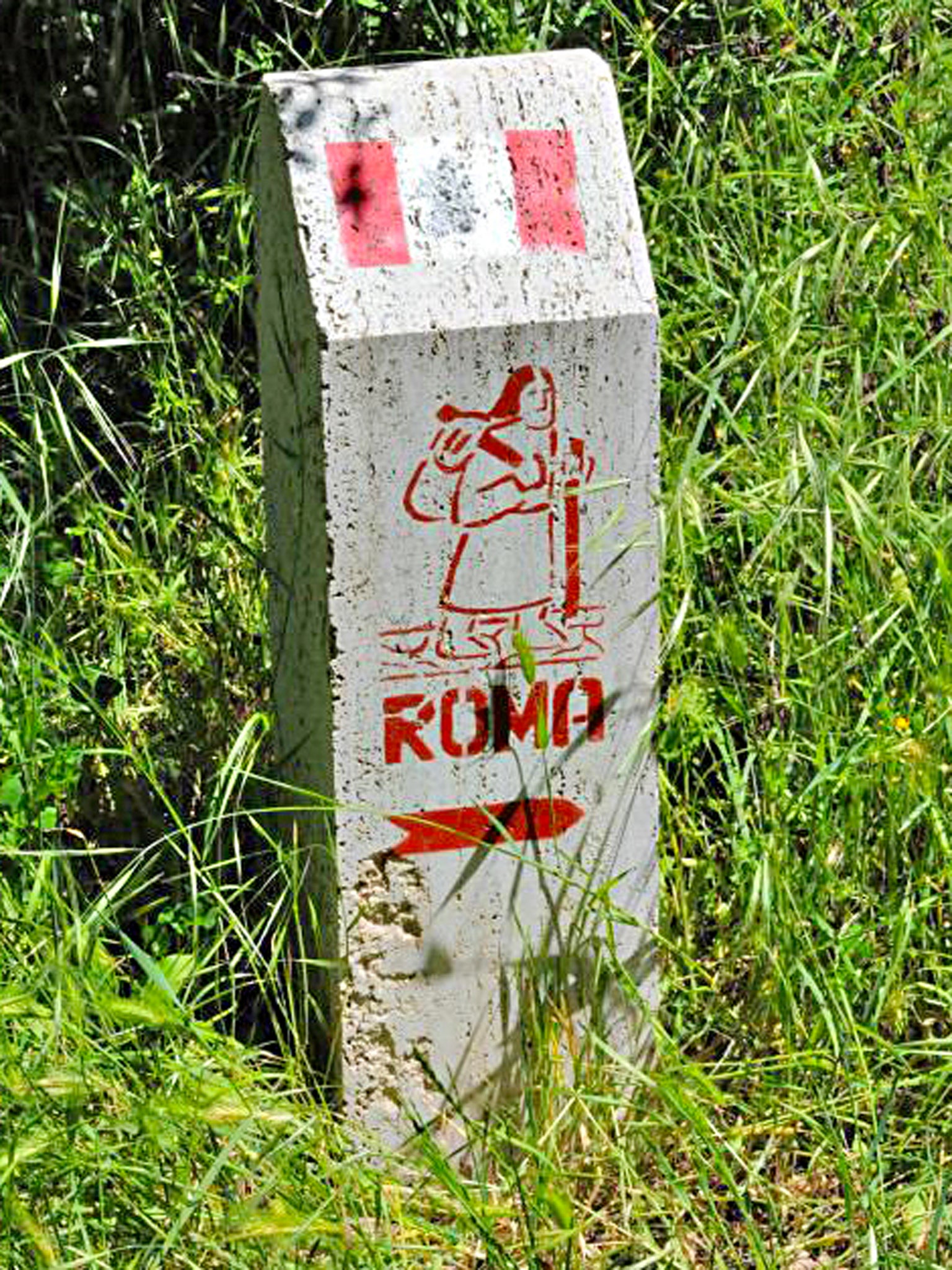 Lunch was in the dappled shade of the Parco di Turona nature reserve, home to some of the loveliest, lushest forest trails I've ever wandered through. The only sounds were those of the river Turona and a particularly happy cuckoo; the only movement came from scuttling lizards and zillions of butterflies swooping madly. Here I spotted the first concrete marker with the magic word "Roma" under a stencilled pilgrim, reminding me that this was an important route – even though I had yet to see another soul on it.