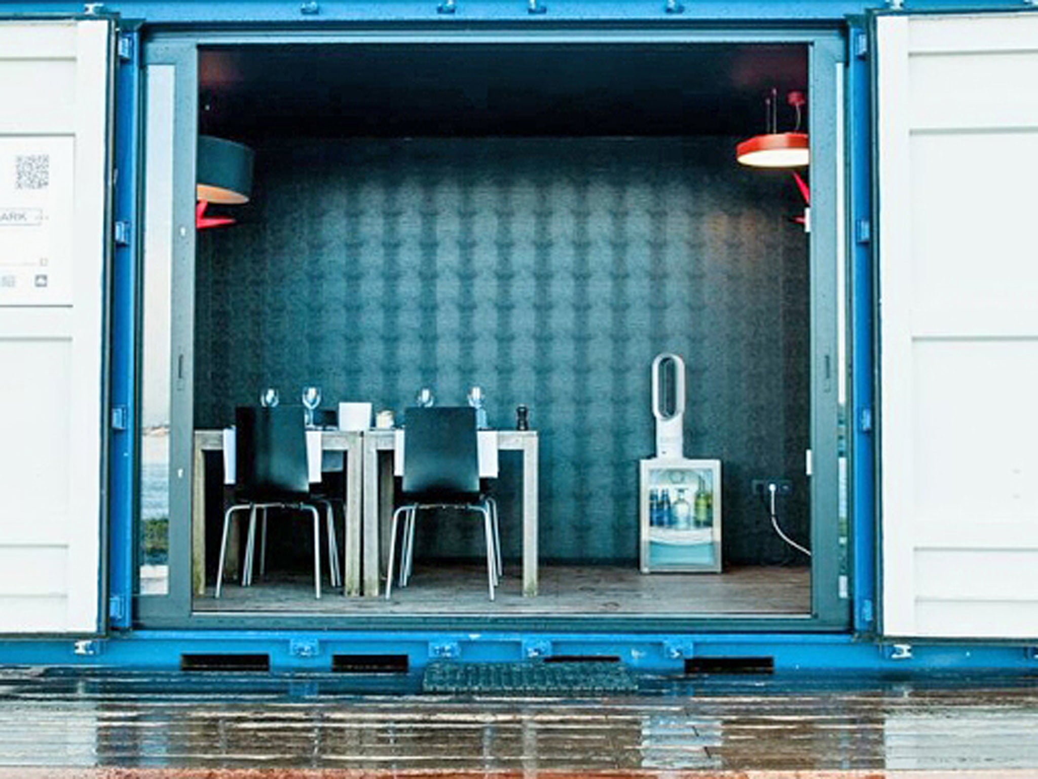 One side of each container has been transformed into sliding doors which open on to a decked terrace. The glass wall removes any sense of claustrophobia and makes you feel part of the environment, while at the same time protecting you from the elements. The wind may be howling outside, but you can sit serenely in the heated box, staring out as the ships sail past, contemplating the city's rich trade and maritime history.