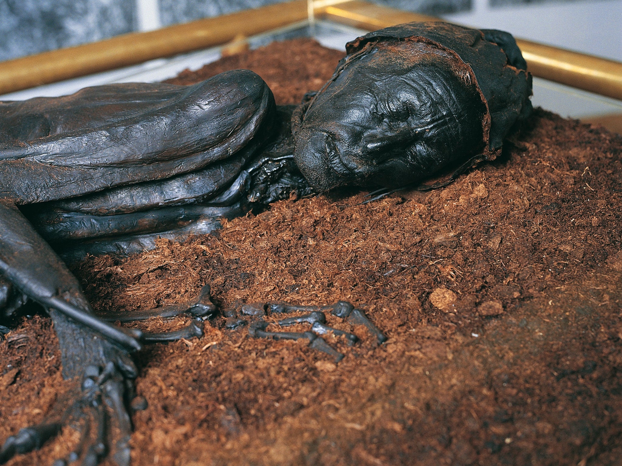 But the roots of the Viking culture can be followed deeper to a glass showcase in the Silkeborg Museum, 30 miles further north. Inside the case is the blackened body of a naked man who has been dead for two and a half millennia. He was found by turf-cutters in a bog nearby in 1950, perfectly preserved by the peat. He lies on his left side, curled as though in sleep. You can see his eyebrows, his high Nordic cheekbones, the stubble on his chin. You can stare into the slightly smiling face of a man from 350BC. And then you will notice the leather noose around his neck.