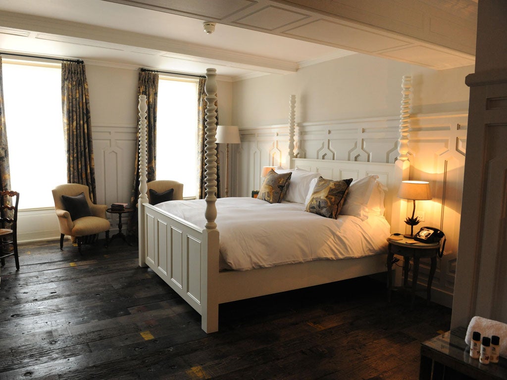 My room, No 7, certainly lives up to its Spacious name and comes with wooden floorboards, corkscrew four-poster bed and a stand-alone, roll-top bath to one side. There's also an en-suite containing a walk-in monsoon shower, but the somewhat awkward, restricted space means there's no door to shut it off from the bedroom. I'm promised that mine's the only room with this dubious design quirk, so book one of the others if you're a stickler for privacy.