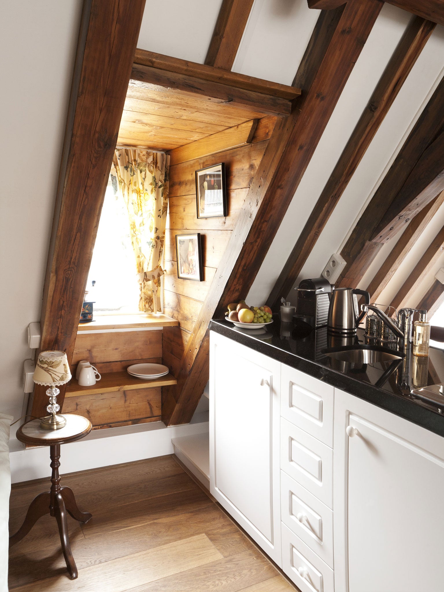 The Silk Room on the lower ground floor has its own front door while the larger third-floor Suite sits under the gabled roof. There's a sitting area with a television, vintage-style radio and iDock, a kitchenette and a small terrace. And if you're travelling with friends or family, the double-height ceiling hides a second bed reached by pull-down stairs. The bathrooms, decorated with Delft tiles, both have underfloor heating and a tub with powerful shower.