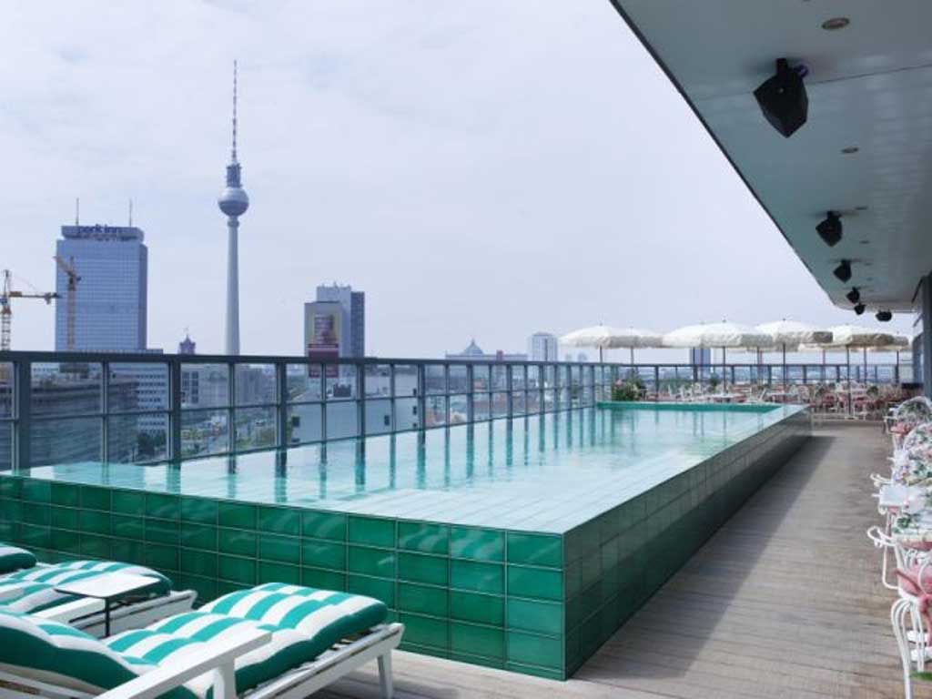 The industrial-chic lobby has also just had a makeover that has softened its somewhat cold, overtly trendy aesthetic – Damien Hirst graffiti and all – with a vast and intricate chandelier, sofas and leather armchairs. A collection of ping-pong tables, something of a fashion in Berlin, has been moved upstairs. To find them, take the lifts, lined with purposely defaced tan leather (the only instance where the hotel's stylometer goes off the scale), that also whisk you up to the guestrooms, Club Floor and rooftop pool and bar.