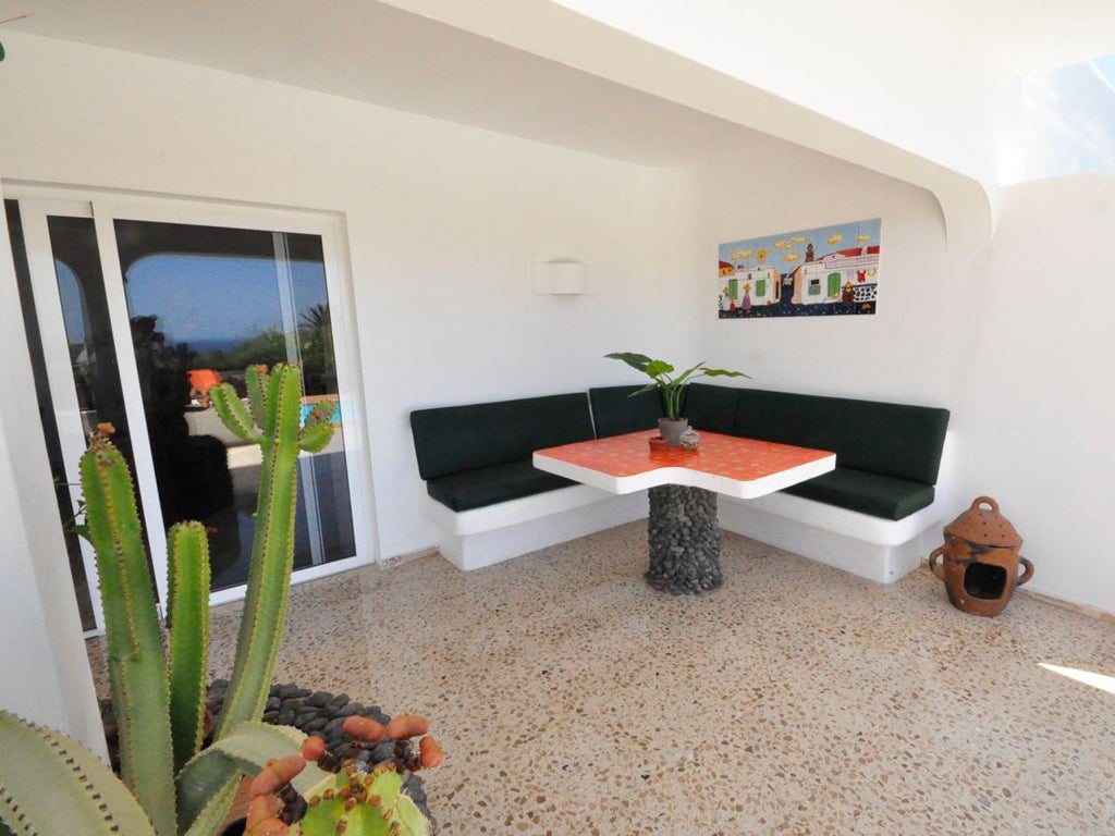 El Nido is a three-bedroom, three-bathroom house at the upmarket Puerto Calero marina. The villa was built in 1978 by fans of Lanzarote's favourite son, the artist César Manrique, and Heidi has worked with the current owners to bring out the glory of the Seventies styling. They've buffed up the sparkly polished granite flooring that flows through most of the property (check out the lino in the larder – Orla Kiely would die for this design). The bathrooms may have been necessarily updated for guests' comfort, yet in the living room the wall, clad with multicoloured lava rock from the national park, has been preserved. So, too, has the centrepiece of the property, a bar in "Manrique style", an adobe-like hulk of rough plaster finished in the shiny white paint that the artist manufactured commercially (you can buy it for about €200 a tin on the island). Other Seventies references include rush placemats on the dining table, a suite of wicker chairs, and, the most glorious touch, a table topped in floral orange tiles with a central leg made of rocks from Manrique's birthplace, Famara, in the north-west of the island.