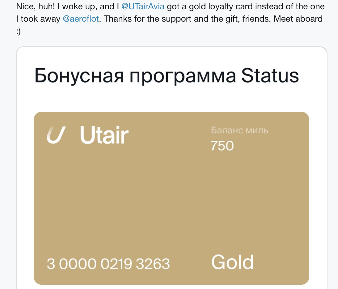 A rival of Aeroflot, the Russian airline Utair, has awarded Mr Aleshkovsky gold card status – though the carrier is only one quarter of the size of Aeroflot so it does not offer the same range of flights.